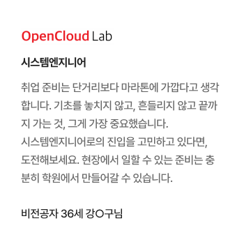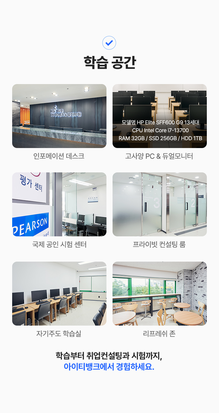 과정중에는 취업지원상담, 취업특강이 진행되며, 과정 수료 후에는 6개월간 사후취업관리를 받으실 수 있습니다.