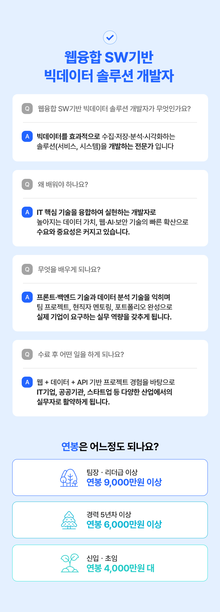프론트엔드 개발자, 백엔드 개발자, 풀스택 웹개발자, 빅데이터 솔루션 개발자, 데이터 기반 웹서비스, 공공기관 빅데이터 전문가, SI프로젝트 개발자, ERP/CRM 솔루션, 크로스 플랫폼 개발자, QA/웹운영/기획자